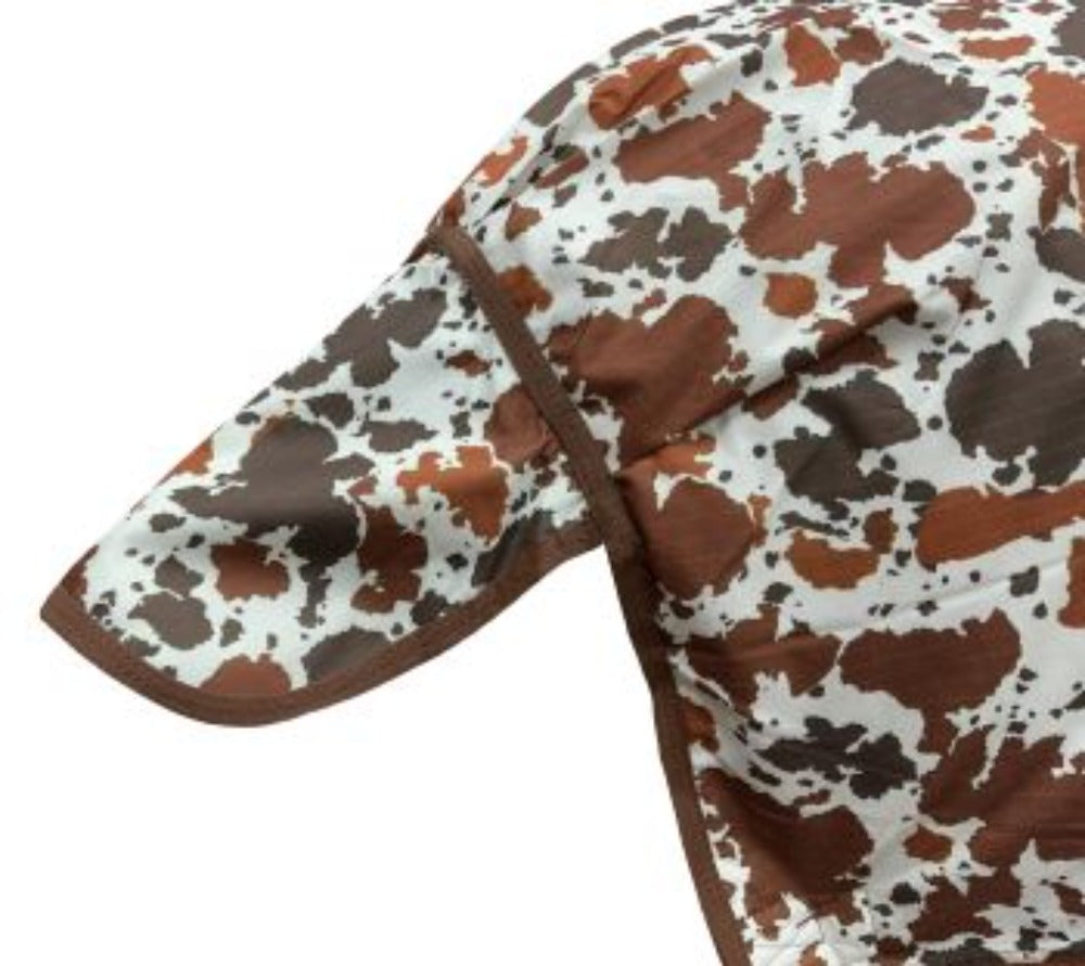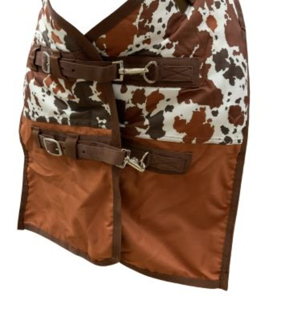 The fitted, contoured shape of this blanket along with the shoulder gussets allow the horse to move naturally while staying in place. Featuring a trendy cow print, this blanket is made with an adjustable open front. Easily adjust the leg straps with stainless-steel nickel-plated bull snaps that will endure any weather.