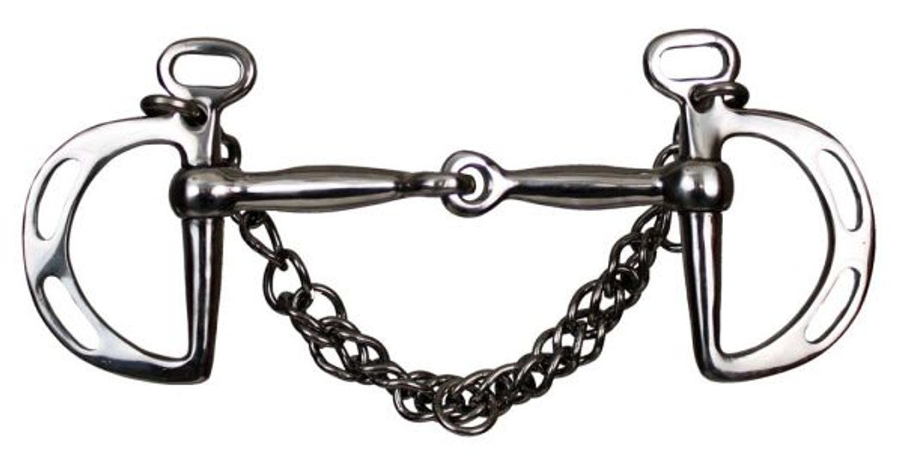 stainless steel snaffle mouth slotted kimberwick with 5" mouth. Features 2 1/2" dee's, curb chain and hooks.