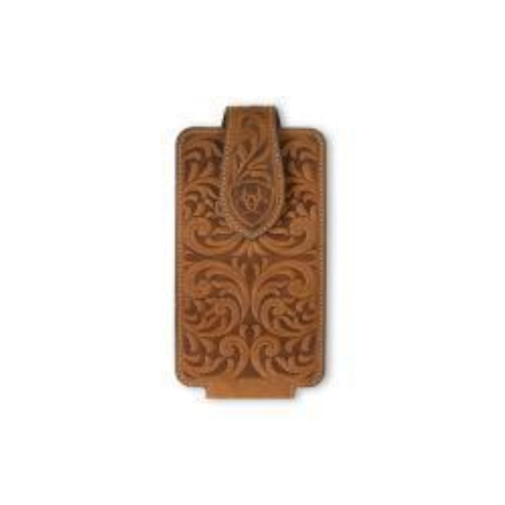 Large Ariat cell phone case by M&F Western Products in genuine medium brown leather. Embossed Ariat shield and scrolling design. Plastic, rotating belt clip on the back.