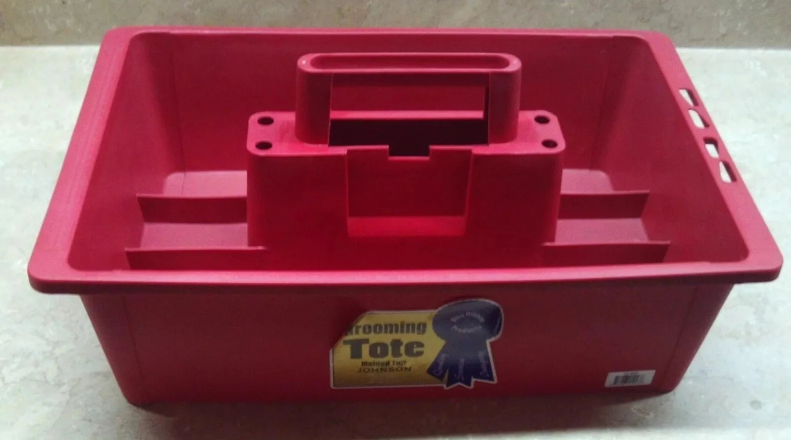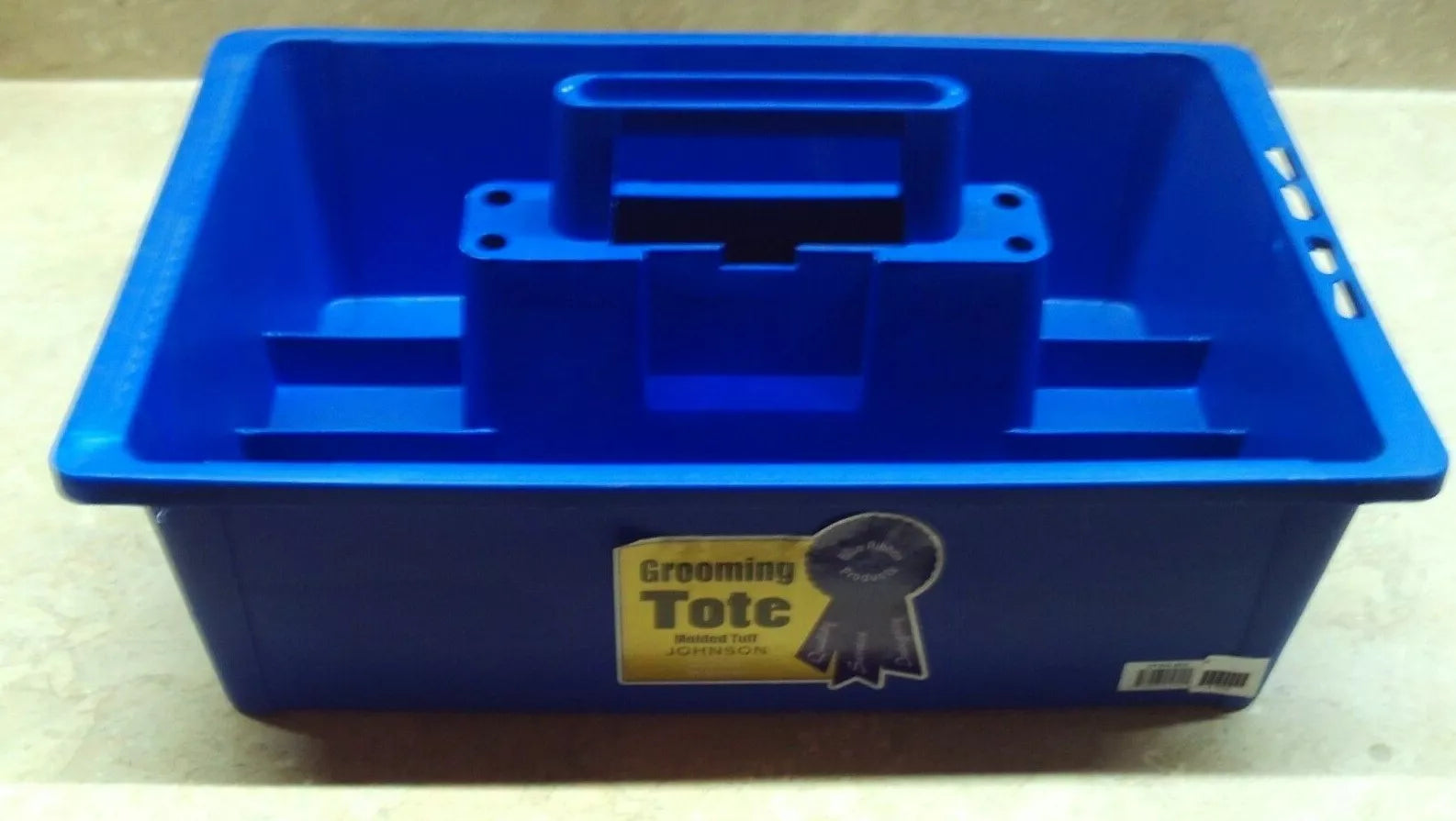 Keep grooming supplies organized with the BLUE RIBBON GROOMING TOTE. Extra thick sidewalls and compartments make this tote / caddy the one that will last a long time. Compartments hold brushes, creams and sprays. Handle now features holes to hold picks and tools. Ideal for storing household cleaning or automotive supplies. Choice of colors: red, hunter green, blue. Measures 20" x 13" x 6".