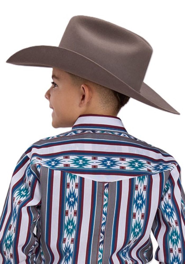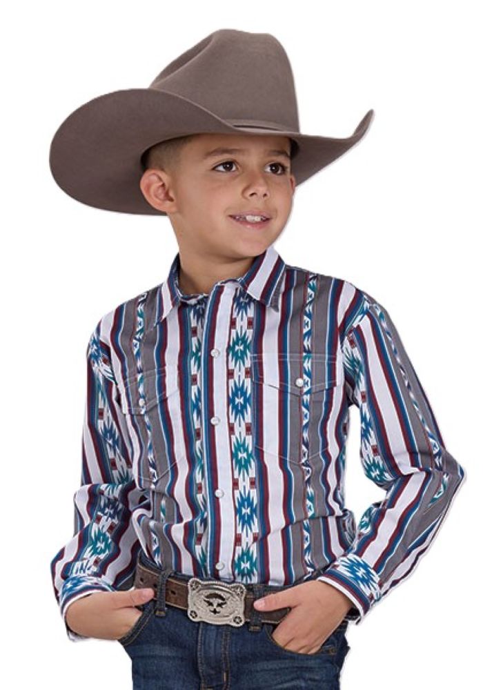 Crafted from 100% cotton poplin, this Roper Vintage Collection shirt features a stylish vertical Aztec print, pearl snap front, and 1-point back yoke. With no front yokes and a garment-washed finish, it's a comfortable and fashionable choice for any young cowboy.