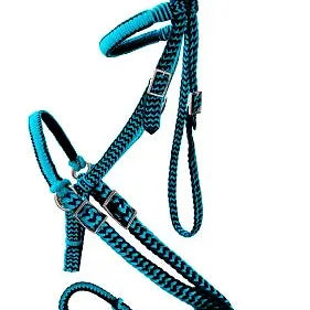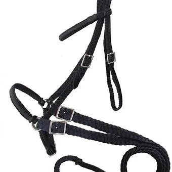 Braided nylon bitless bridle with reins. This bridle is constructed of braided nylon allowing for a custom adjustment to the horse. The bridle does not use a bit and does not apply pressure directly to the mouth, instead, pulling at the sides. Great for horses that will not take a bit. Bridle comes with braided nylon reins with knot ends.