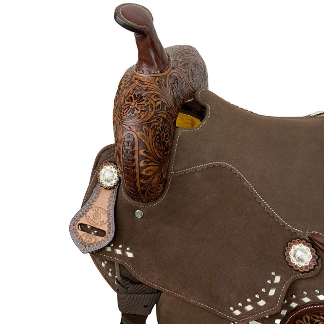 The saddle also includes a leather tie strap and off billet, ensuring a secure and durable attachment. The aluminum stirrups are lightweight yet robust, offering stability and ease of use for the rider. Whether for competitive barrel racing or leisurely trail rides, this Circle S® Chocolate Calico Barrel Style Saddle combines beauty, comfort, and durability, making it a perfect choice for riders who demand both performance and style.