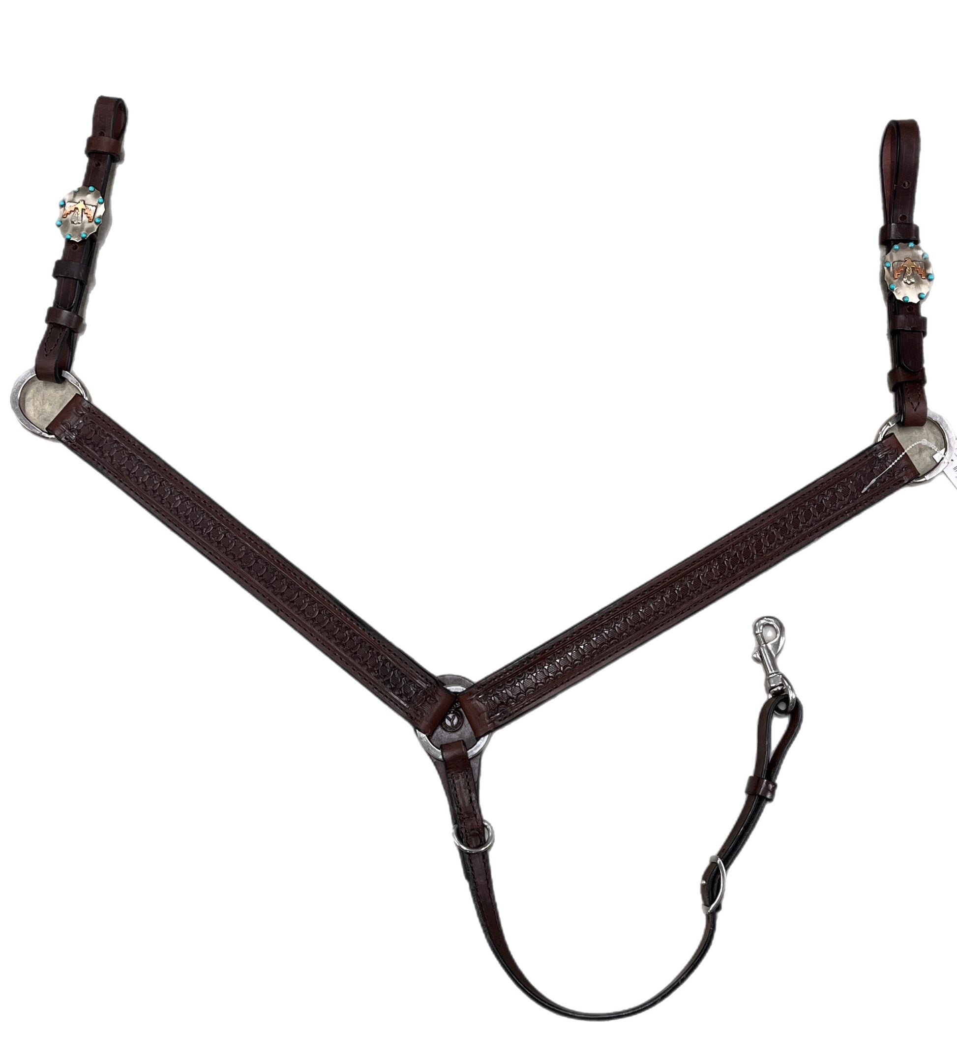 Ranch meets arena performance with our all-new Windsor breast collar! Whether you’re dominating in the arena or confidently navigating a ranch, this piece of quality leather tack is sure to turn heads. Get ready to experience the pinnacle of luxurious performance: it features beautiful Diamond Waffle border tooling and gorgeous Thunderbird Gem conchos. This is a breast collar you won’t want to miss out on!