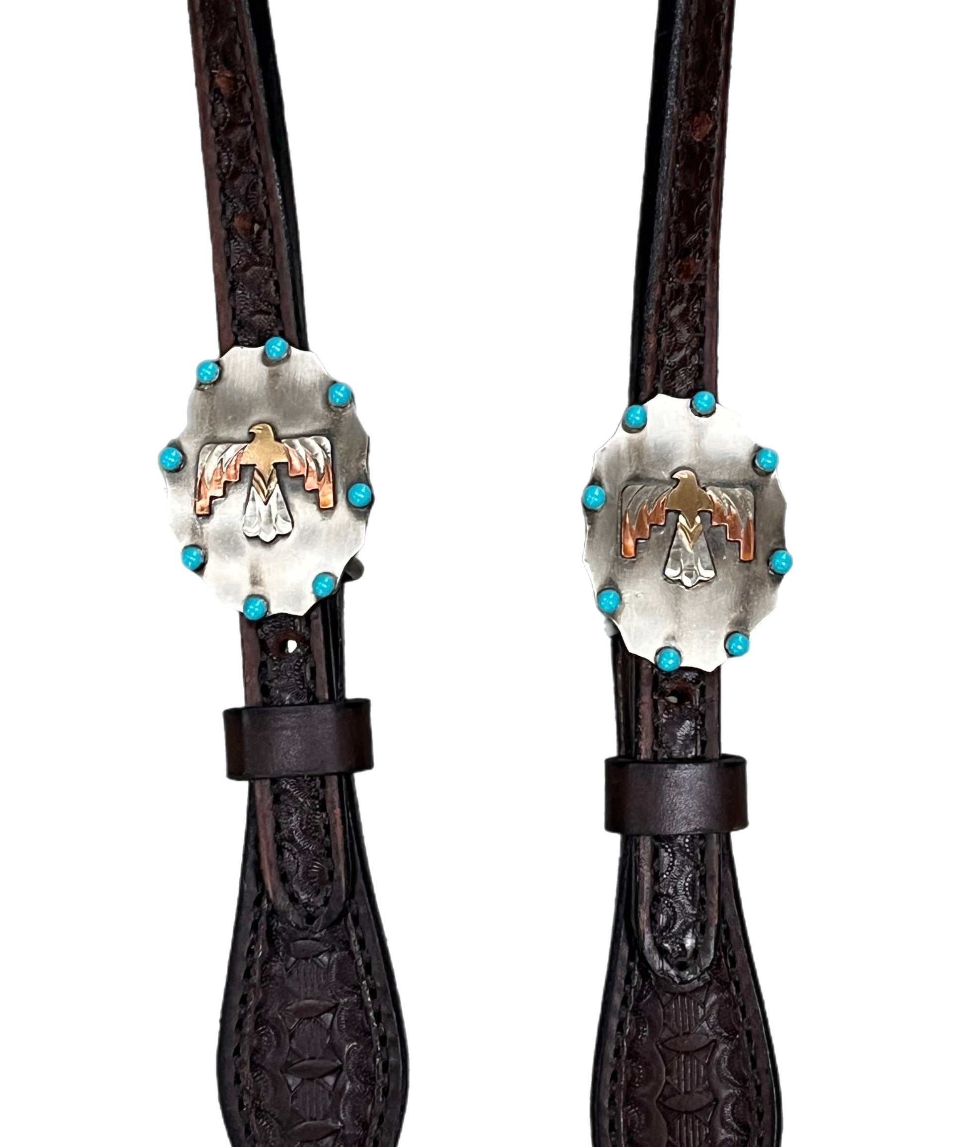 This headstall shows off traditional, American-made craftsmanship. Made in Yoakum, TX from quality leather, it has intricate diamond waffle tooling and custom turquoise thunderbird conchos for a classic Western look.