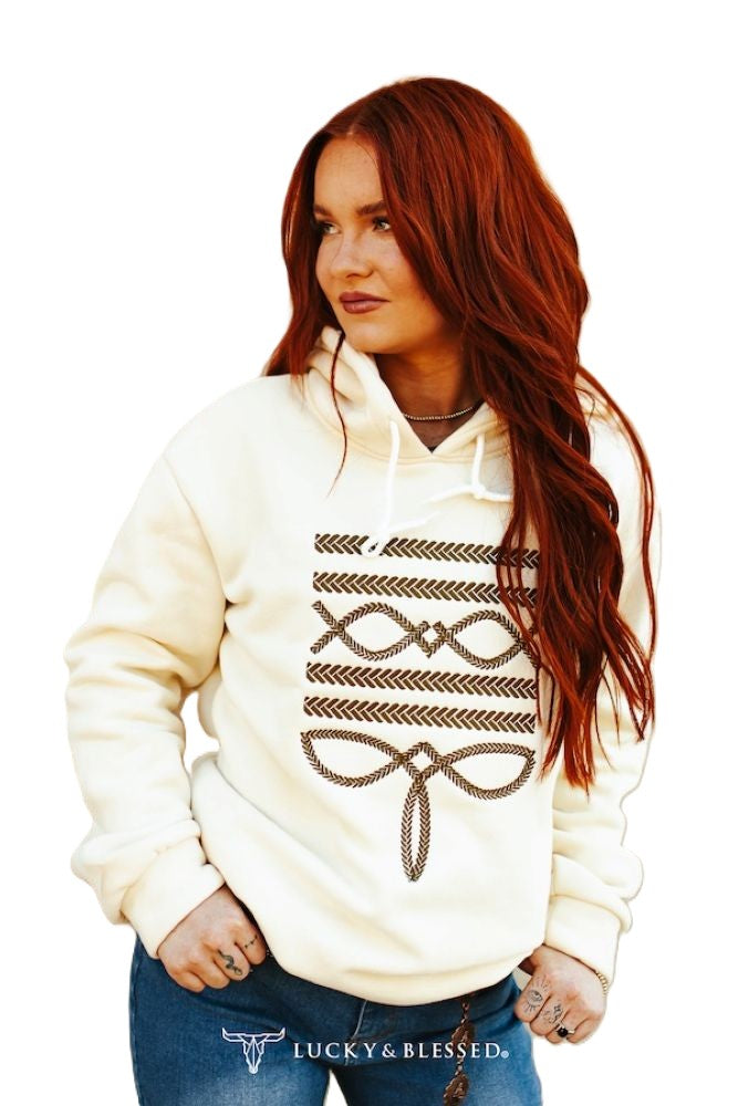 Wrap your boutique customers in warmth and western flair with this black-colored hoodie designed for style-savvy cowgirls. Featuring a bold, embroidered rope design across the front, this hoodie blends rustic charm with cozy streetwear comfort. The intricate artwork mimics traditional rope lasso loops and is arranged in a visually striking stacked pattern, paying homage to Western heritage with a modern twist. Crafted from premium fleece fabric, this pullover hoodie includes a functional drawstring hood and a relaxed fit, perfect for layering on chilly rodeo nights or pairing with denim for casual Western looks. Whether stocked in a boutique or sold at pop-up markets, this must-have hoodie delivers comfort and cowboy energy for the trend-forward Western woman.