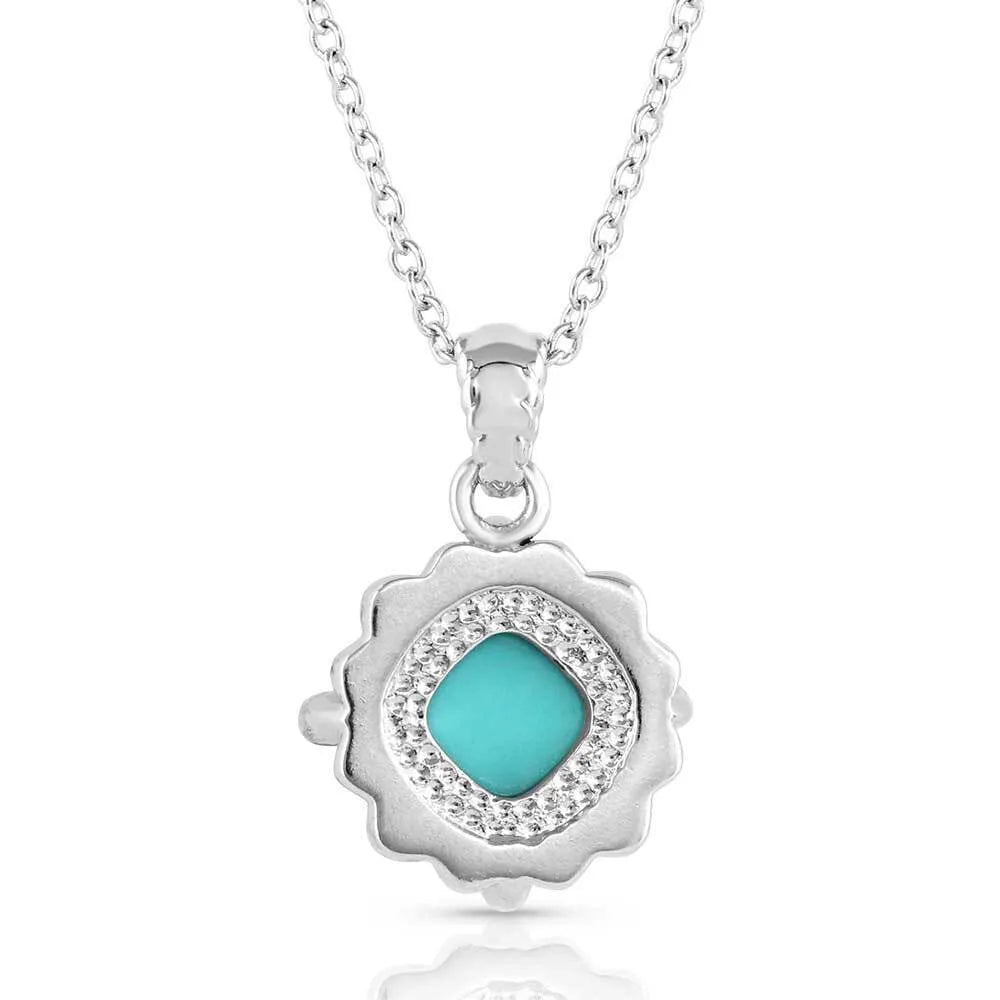 This necklace has the perfect combination of sparkle, turquoise and Southwest flair. The Crystal Cornerstone Necklace features a large square turquoise stone in the center with a small clear cubic zirconia crystal on each corner. The center is surrounded by a silver tone scalloped edge that ties the whole design together. Completed with a 19 inch silver tone adjustable chain, this necklace can be a foundational element of any outfit.