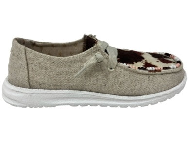 The Gypsy Jazz 'Clarissa' Cowprint Vamp Shoe With Beading is perfect for those seeking a unique style. This shoe features natural color fabric and a faux cowhide vamp with beading accents, making it a fashionable and eye-catching piece. Elevate your look with the classic look and timeless design of this shoe.