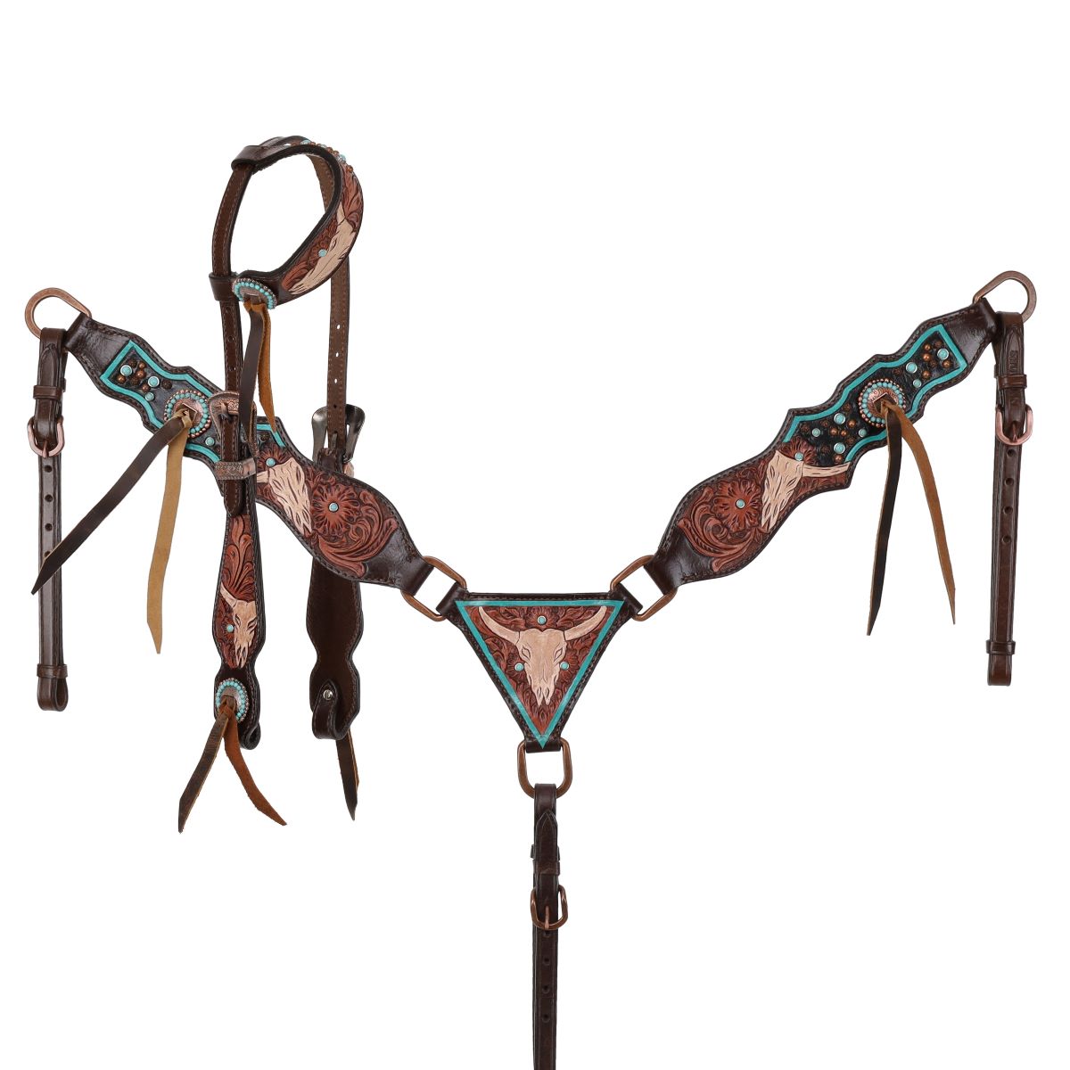 Accentuating this unique design are copper and turquoise stud accents that bring an eye-catching contrast, along with copper and turquoise clotted conchos featuring leather ties for added flair. The headstall includes copper dual-adjustable cheeks for a perfect, customizable fit, ensuring comfort for your horse and ease of use for you. This limited-edition set is not just tack—it's a work of art that blends form and function, making it a must-have for riders who appreciate quality and style.