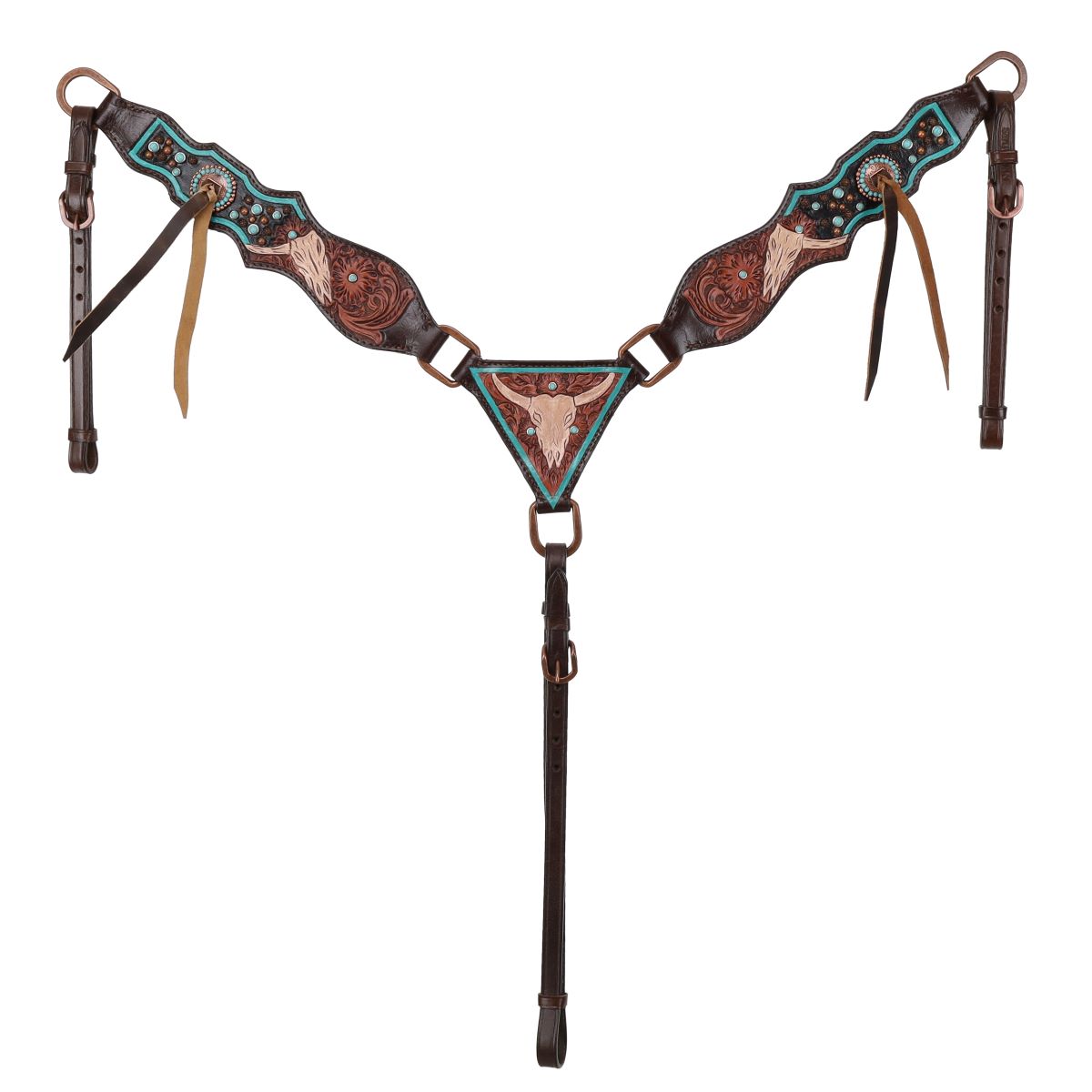 - Decorative Conchos: Copper and turquoise clotted conchos with leather ties for added detail and western flair.