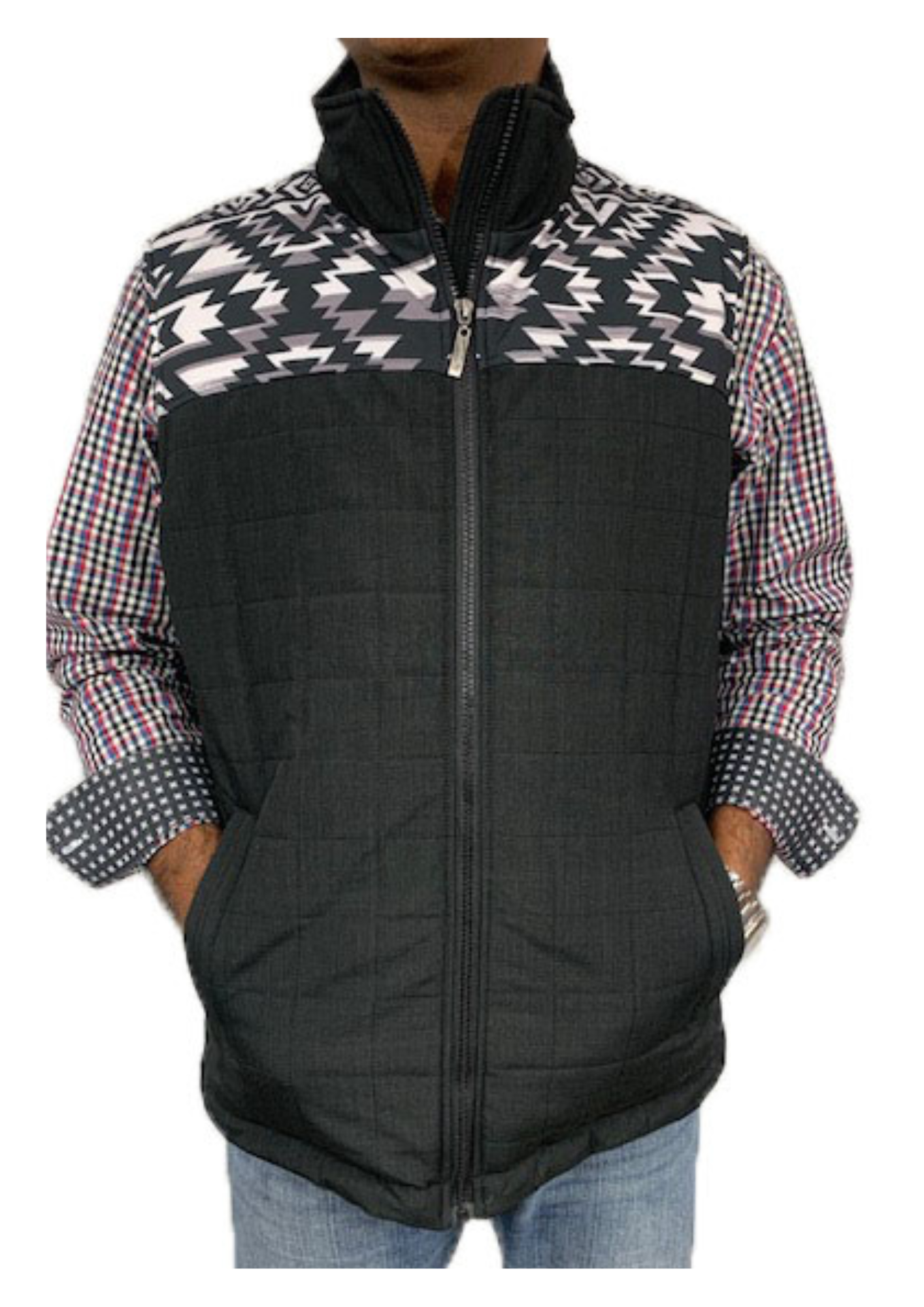 This Men's Montana Co Black Aztec Puff Vest is perfect for adding a stylish layer of warmth to your look. The vest is made with a blend of Calico Polyester and Cotton for an ultra-soft feel and a touch of warmth. It features a classic black and white Aztec pattern and two side pockets for added convenience.