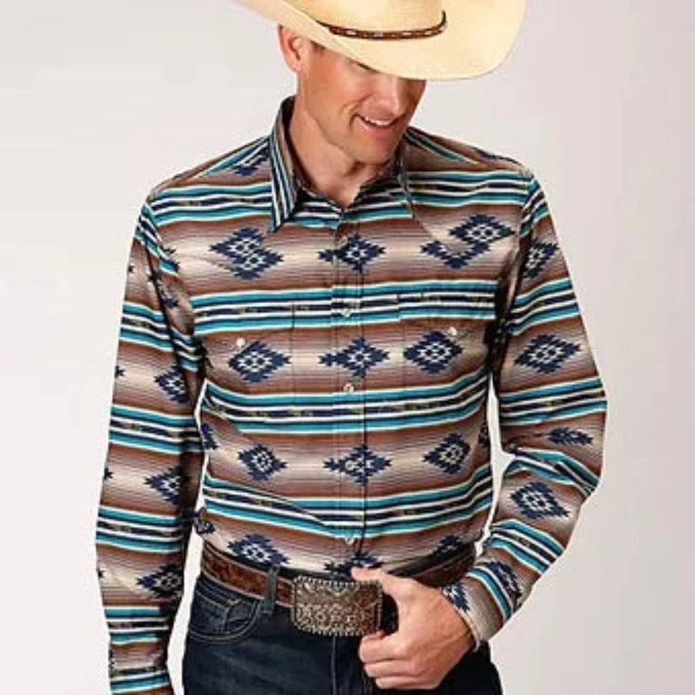 Men's Roper Brown Teal Aztec Print Western Shirt w/ Snaps