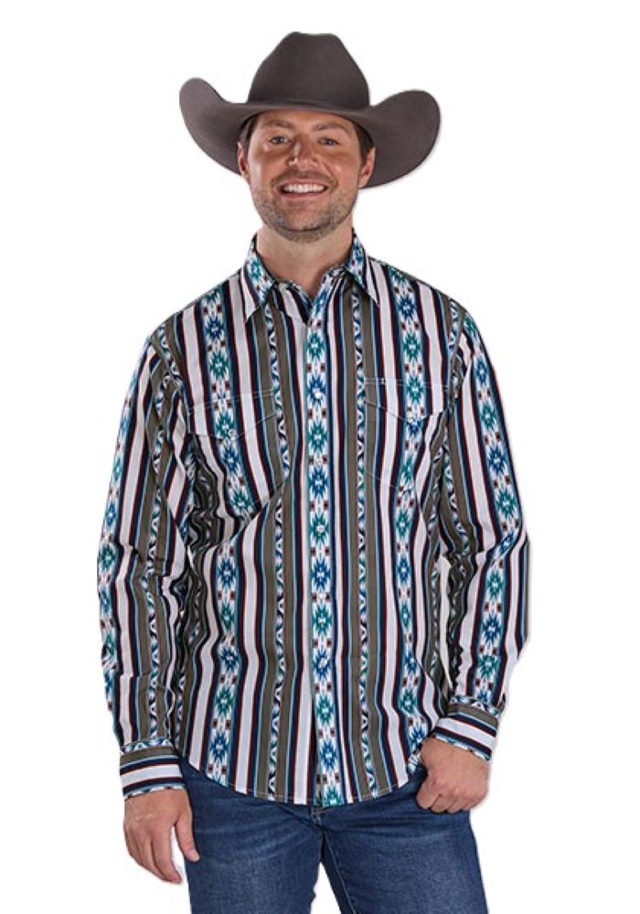 Introducing the Men's Vertical Vintage Retro Stripe Western Shirt from the Roper Vintage Collection. Made with 100% cotton poplin, this long sleeve shirt features a unique vertical Aztec print and pearl snap front. The garment washed finish adds a vintage touch, while the 1 point curved pockets and flaps offer functionality. Upgrade your wardrobe with this timeless piece.