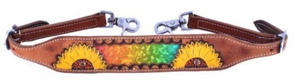 Hand painted sunflower wither strap with multi colored metallic inlay. This wither strap features medium leather with hand painted sunflowers and multi colored metallic inlay. Includes stainless steel hardware.