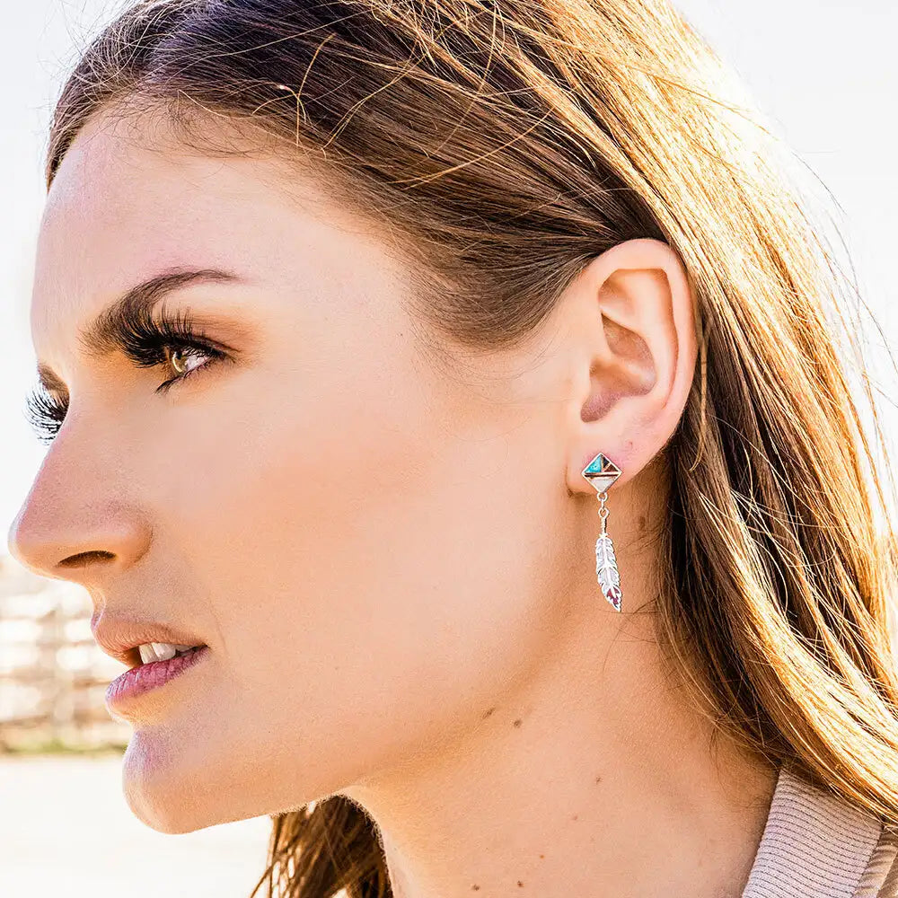 Inspired by our love and respect for wild birds, our American Legends earrings are one of a kind. They begin with diamond-shaped studs that are fastened to stainless steel post backs for ear security. From the stud dangles one single feather. That feather contains a rose gold stem, silver, cream, and blue gems.