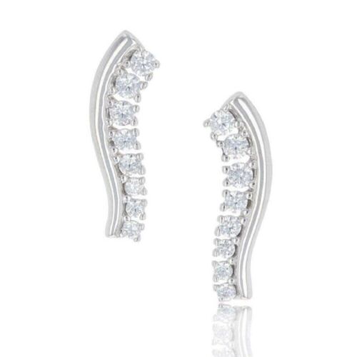 A set of elegant swish earrings. These silver toned earrings have a smooth thick wire-like strand that tapers slightly at the bottom. A corresponding line of clear stones matches the taper of the silver strand, creating a sparkling wave. Earrings have hypoallergenic stainless steel post backs.