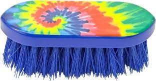 Action brand, plastic Tie Dye Print Dandy Brush with 1 1/2" blue bristles. Measures 5" by 2".