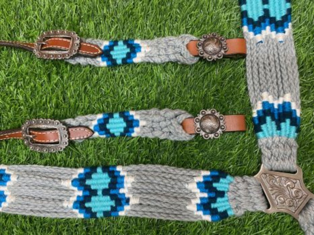Made from durable and high-quality materials, this set is designed to withstand the wear and tear of daily use while retaining its stylish and rustic look. Crafted from high quality, medium oil leather, this corded headstall and breast collar set is sure to draw attention to your horse. Featuring a gray, white, and blue design.