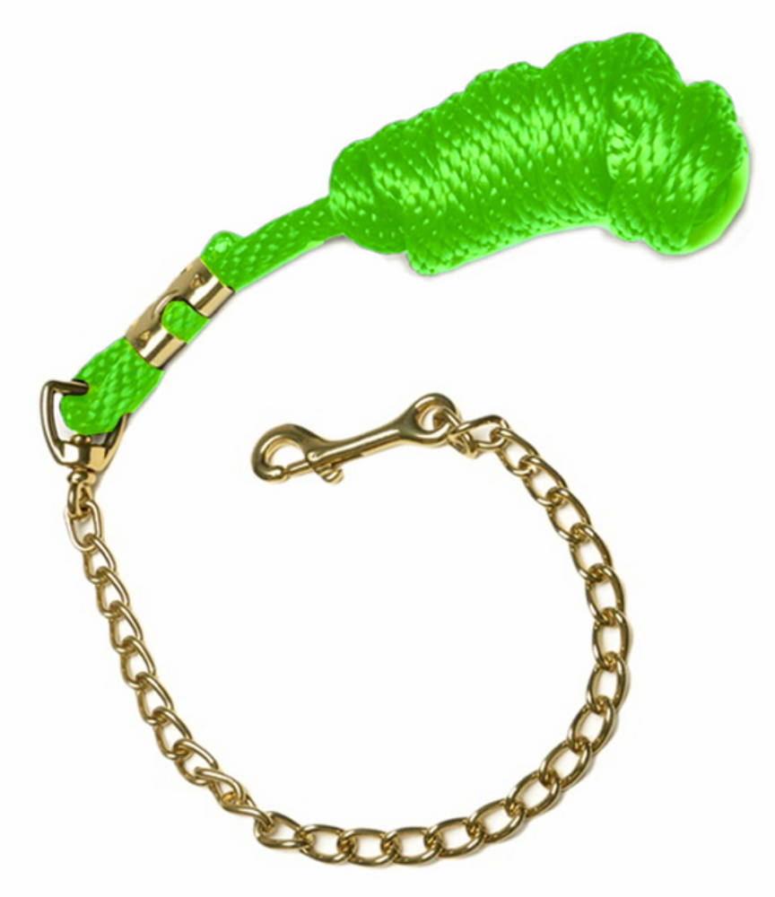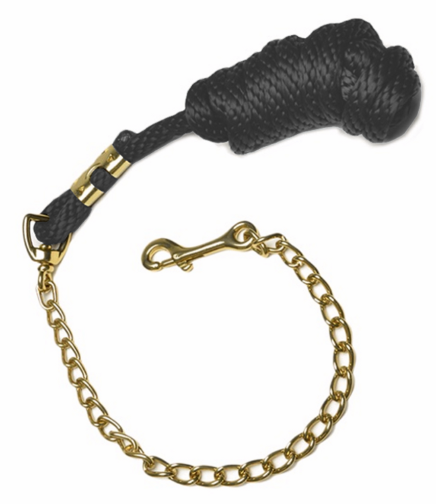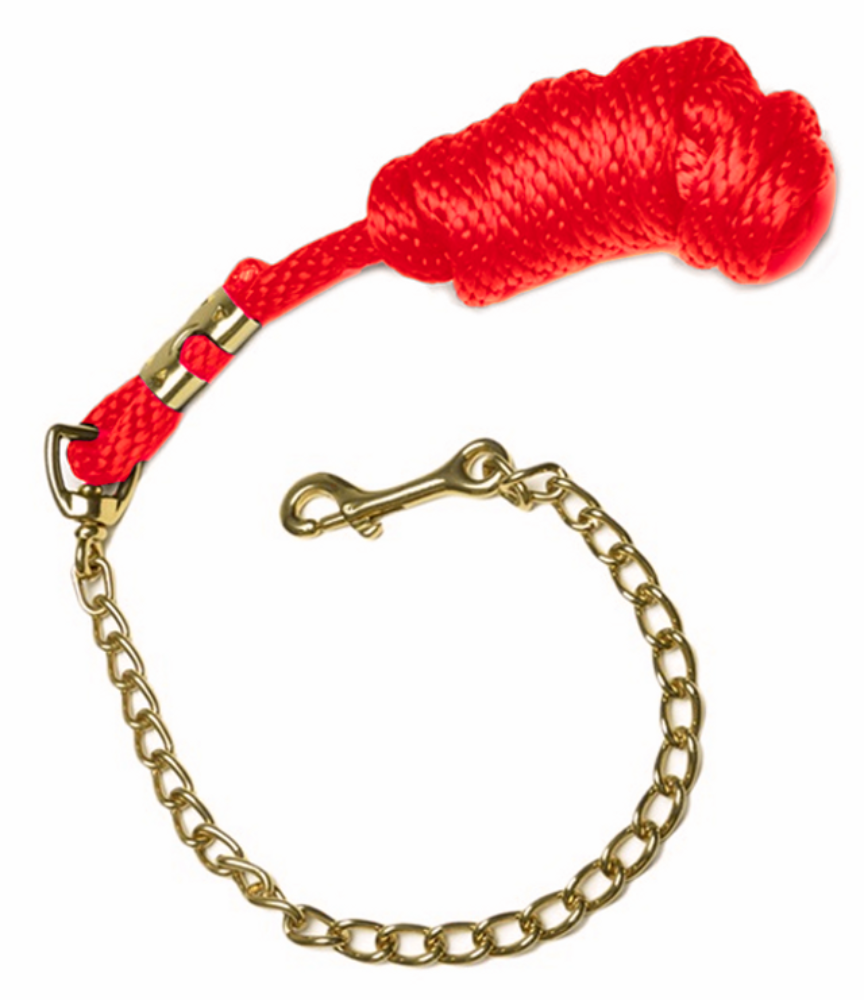 Premium, 5/8" x 10 feet long. With a soft, broken-in feel that is comfortable and kind to the hands. These sturdy lead ropes are made with a 20" brass plated chain.