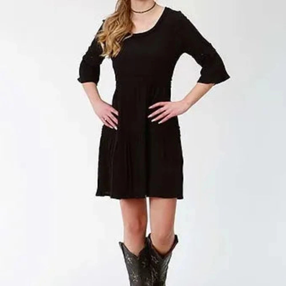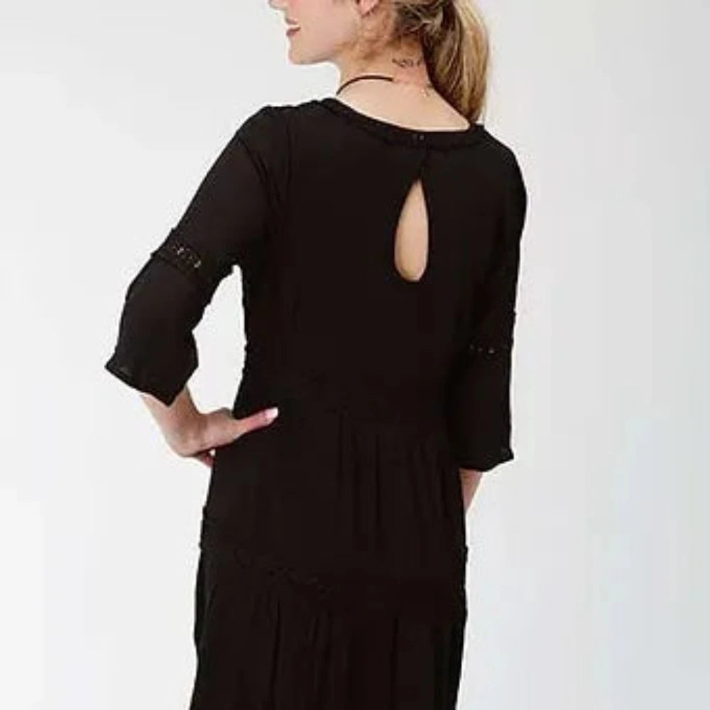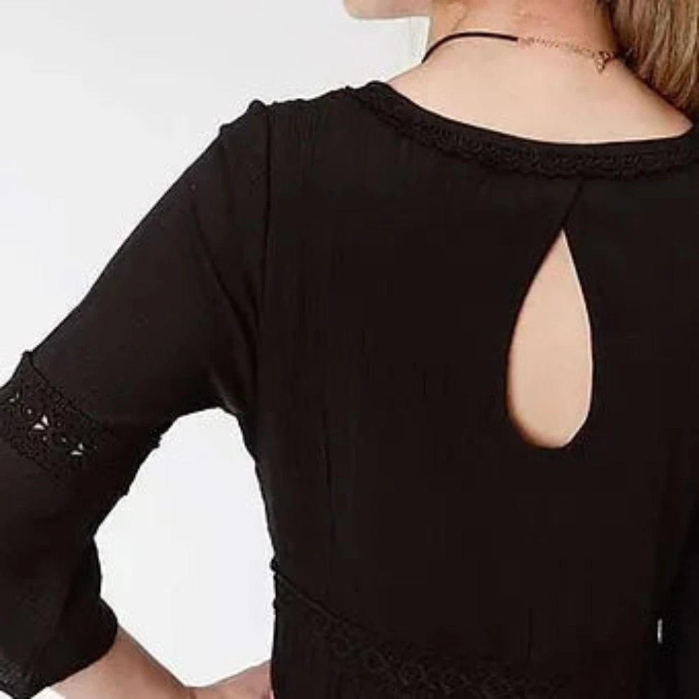 Black Rayon Crepe Casual Dress * Inset Lace Accents * Slight Bell Sleeve * Above The Knee Length