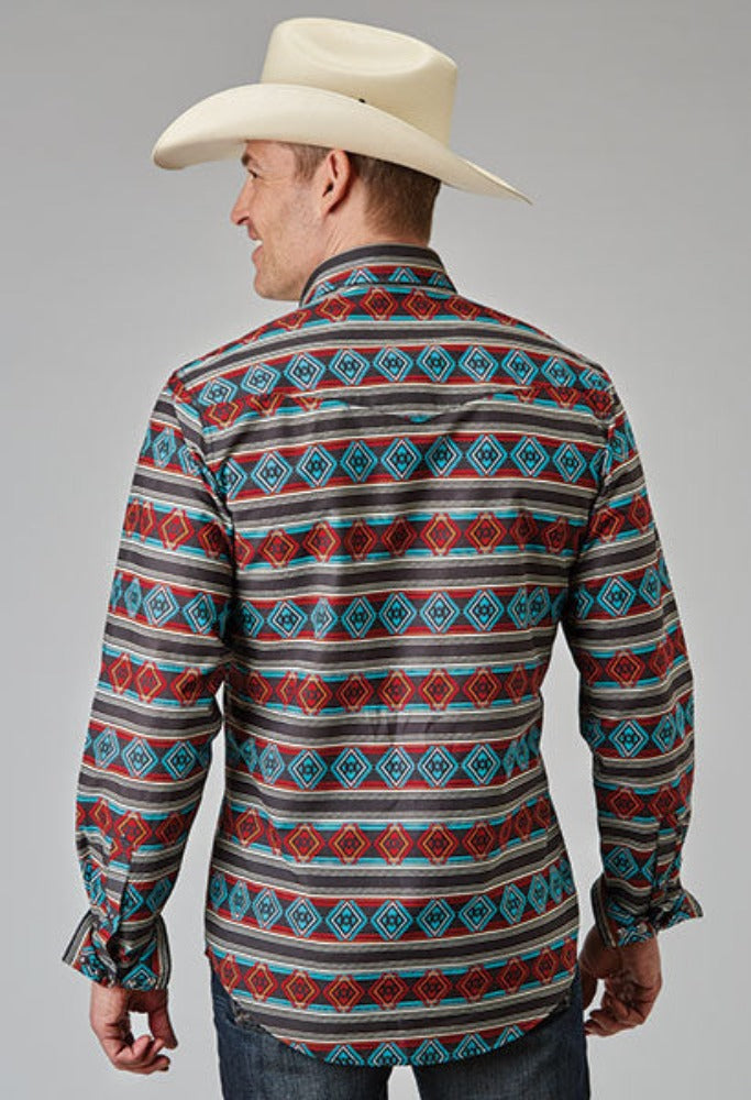 Expertly designed for ultimate comfort and style, the Roper Men's Aztec Stripe Shirt boasts a horizontal print on 100% cotton poplin. With 1 point curved front and back yokes, curved pockets and flaps, and denim inside trim, this shirt offers a unique and sophisticated look. The 3 snap cuff and opaque snap front add a touch of convenience, while the garment washed finish ensures a soft and luxurious feel. Trust in the expertise of Roper for your perfect everyday shirt.