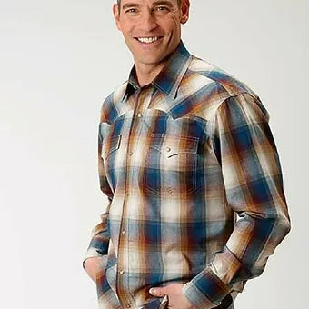 Roper Men's Blue, Tan, Red, Orange Brass Plaid Western Shirt. Available in three US Men Sizes...Size Small, Medium, or 2XL.