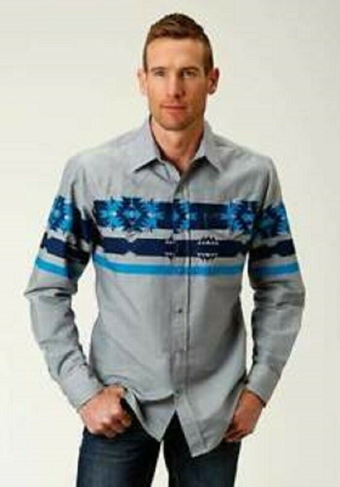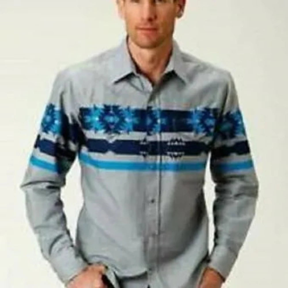 Men's Roper Gray Blue Aztec Border Print Western Shirt