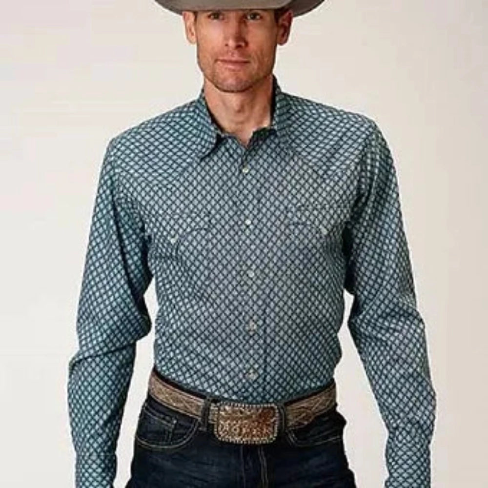 Upgrade your Western wardrobe with Roper's Men's Long-Sleeve Teal & Gray Aztec Geo Print shirt. Crafted from 100% cotton poplin, this shirt boasts 1 Pt curved front & back yokes, shaped 1 Pt curved pockets & flaps, and khaki poplin inside trim for a touch of western flair. With a 3 snap cuff and tan opaque snap front, this garment washed shirt is both stylish and comfortable.