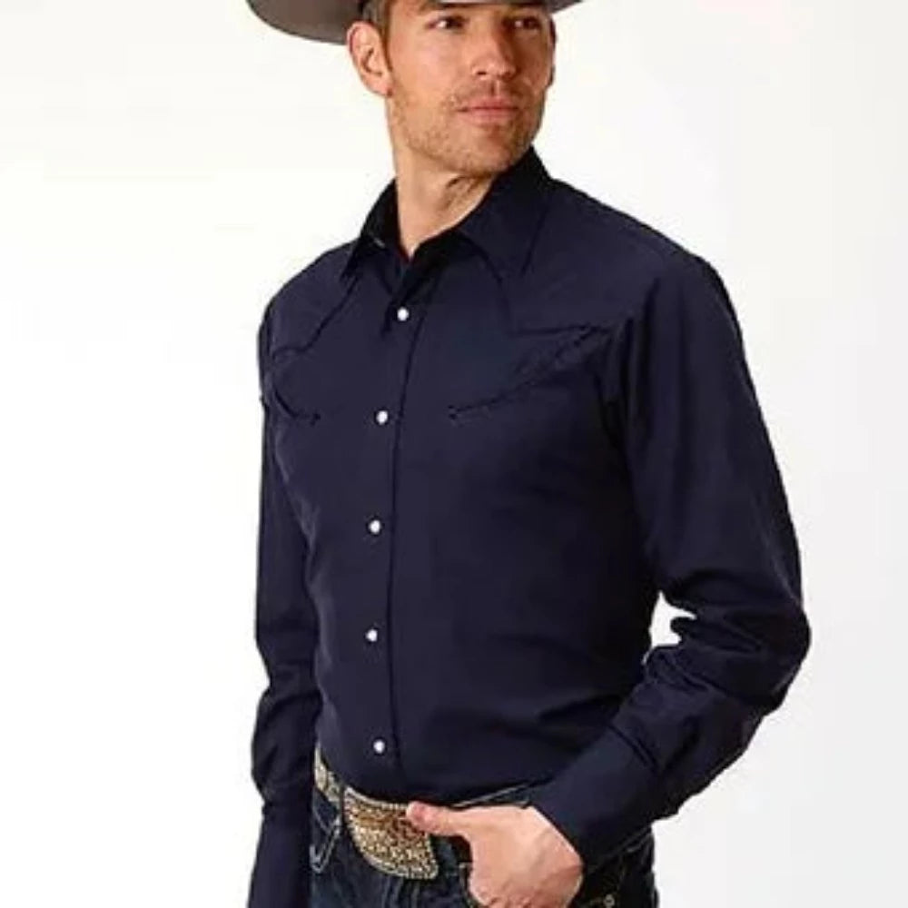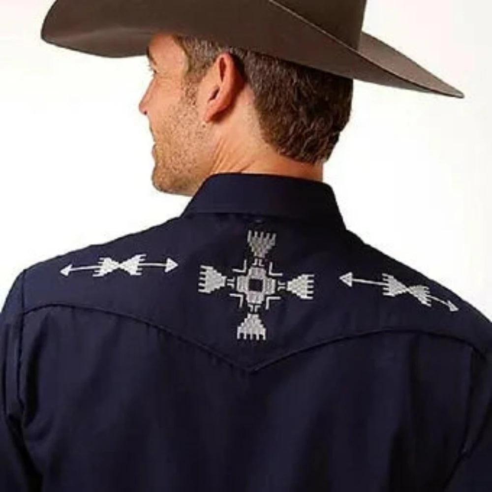 Roper Men's Navy Blue Solid Broadcloth Western Shirt with Aztec Arrow Embroidery on back.
