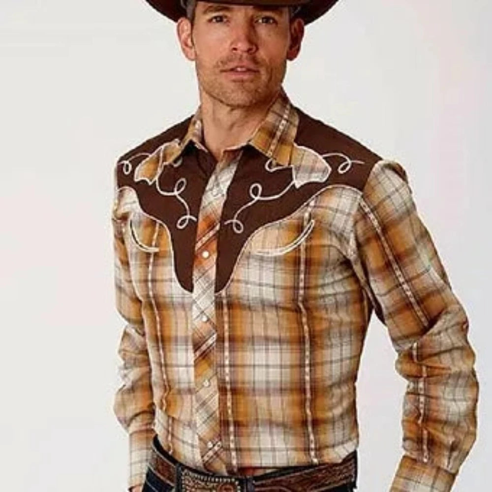 Roper Men's Rust & Cream Plaid Western Shirt with Horse Head and Roping Designs.