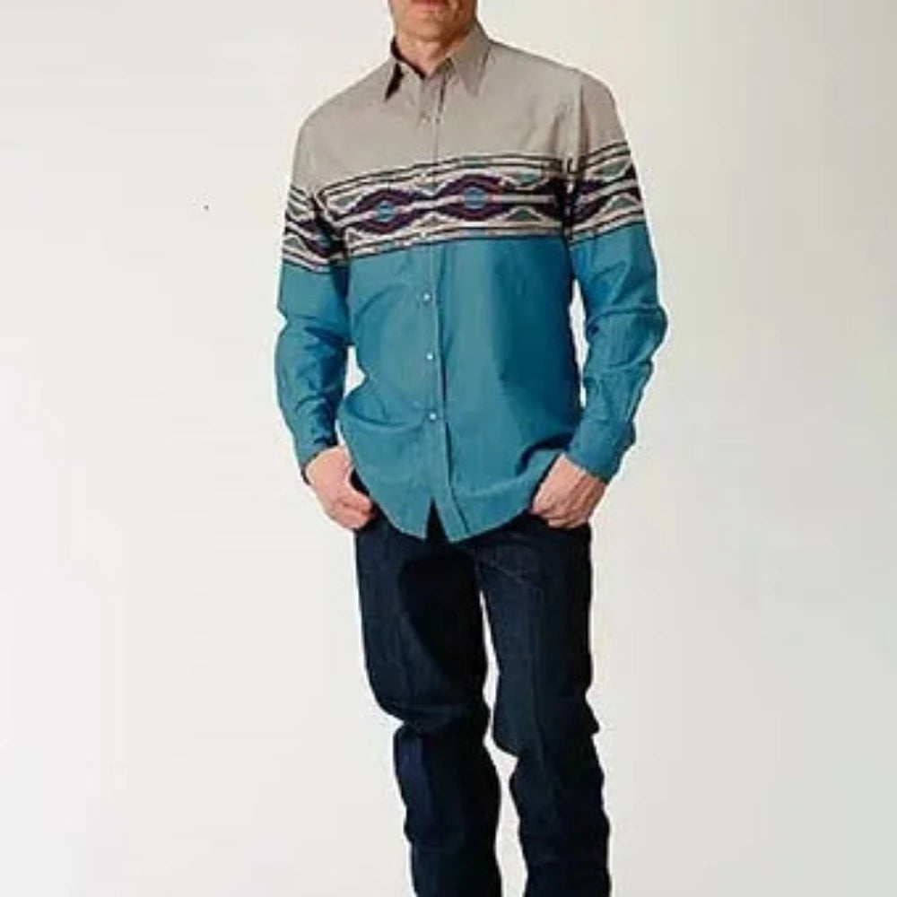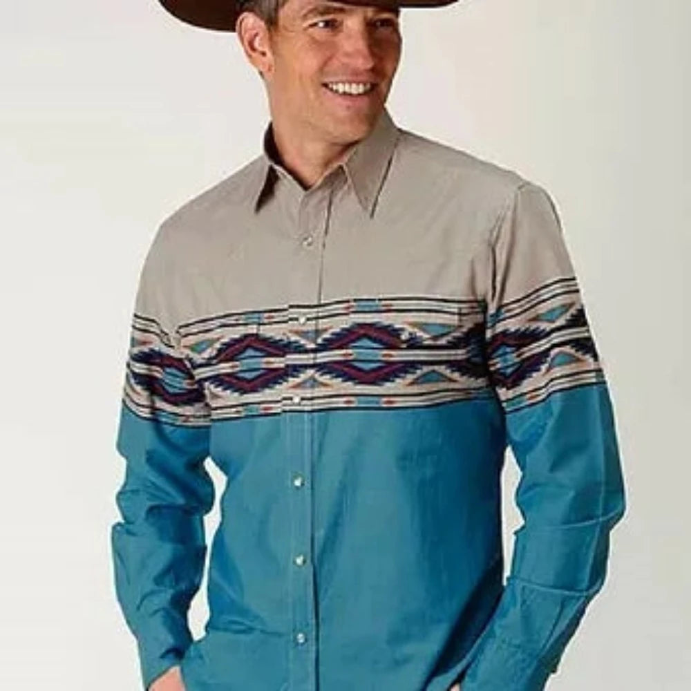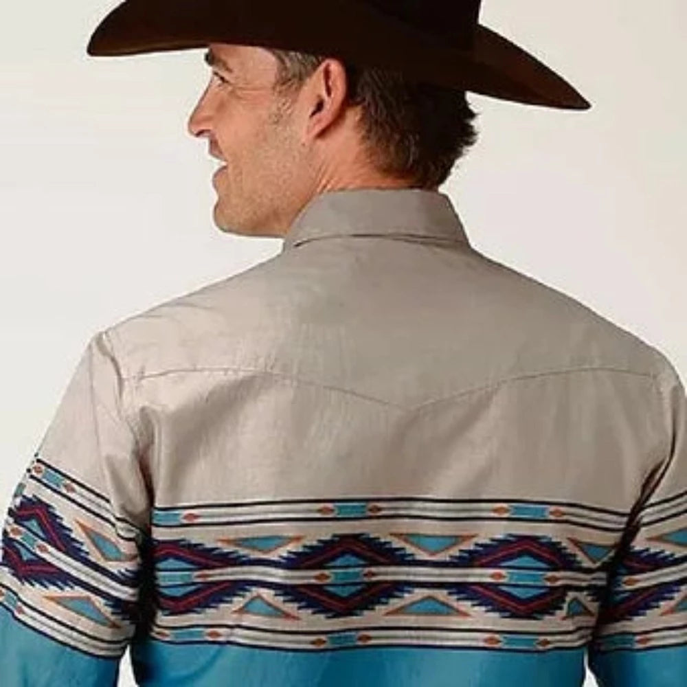 Roper Men's Tan & Turquoise Aztec Border Western Shirt.