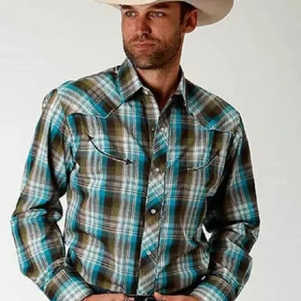 Roper Men's Turquoise & Brown Plaid Snap Up Western Shirt w/ Aztec Embroidery