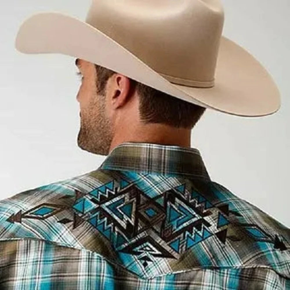 Roper Men's Turquoise, Brown, and White Plaid Western Shirt with back Aztec Design Embroidery.