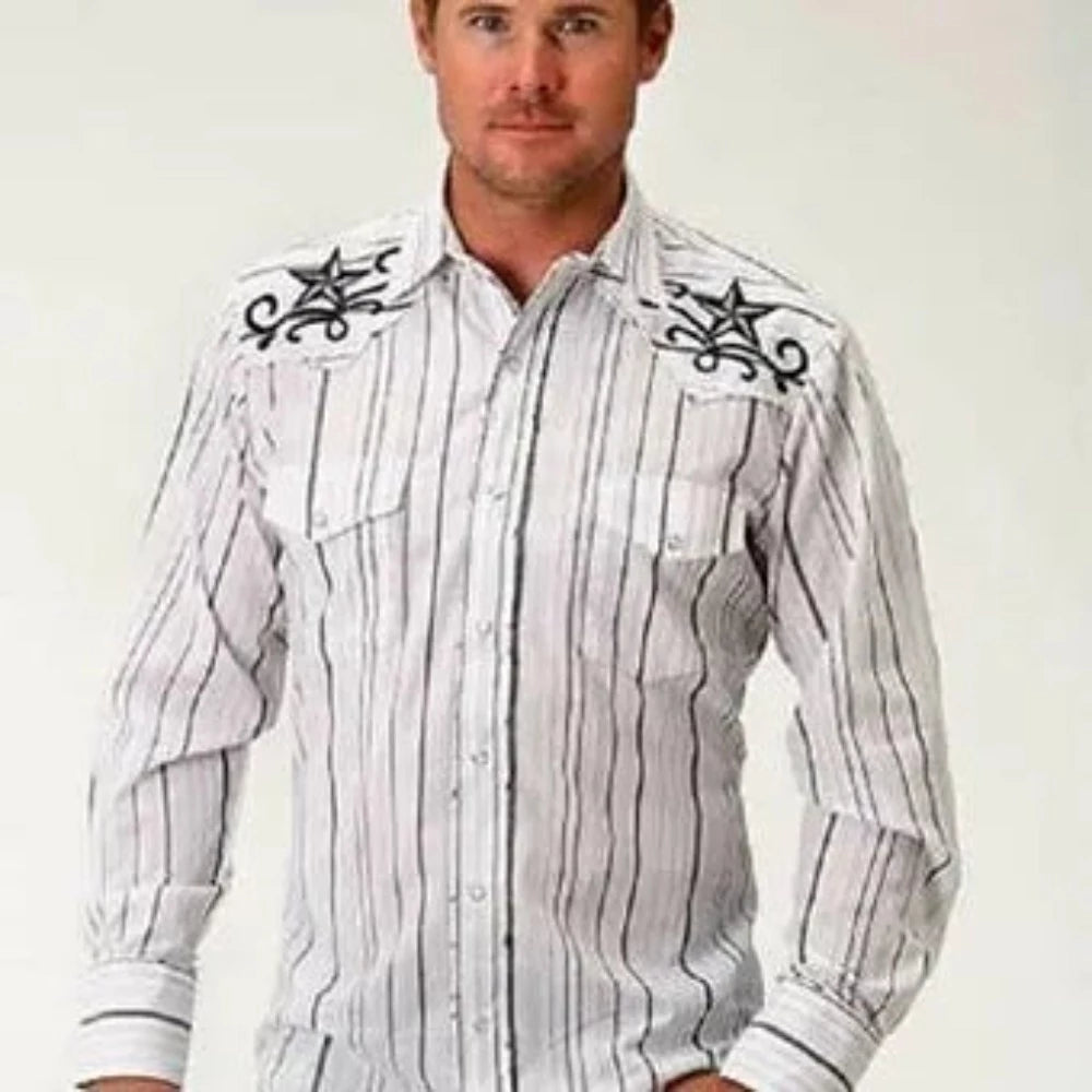 Roper Men's White Gray Stripe Star Embroidery Snap Up Western Shirt