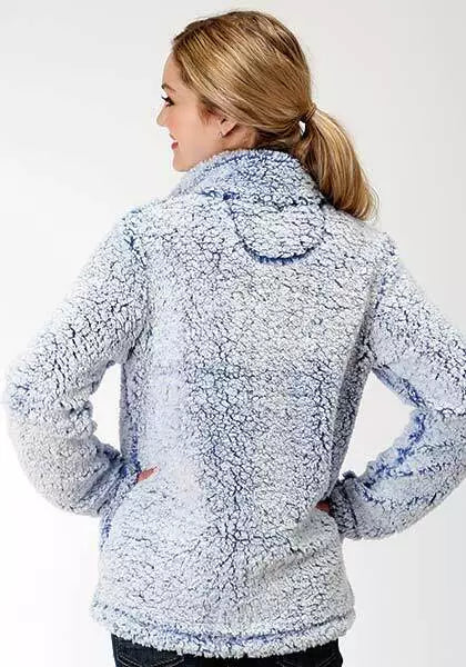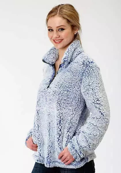 For (1) Roper Women's Fuzzy Fleece 1/4 Zip Pullover. Blue and white. Available in four US Women Sizes...Size M or XL