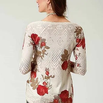 Roper Women's Cream, Tan, and Red Floral Print Shirt Sweater Jersey. Available in five US Women Sizes...Size XS, Small, Medium, Large, or XL.