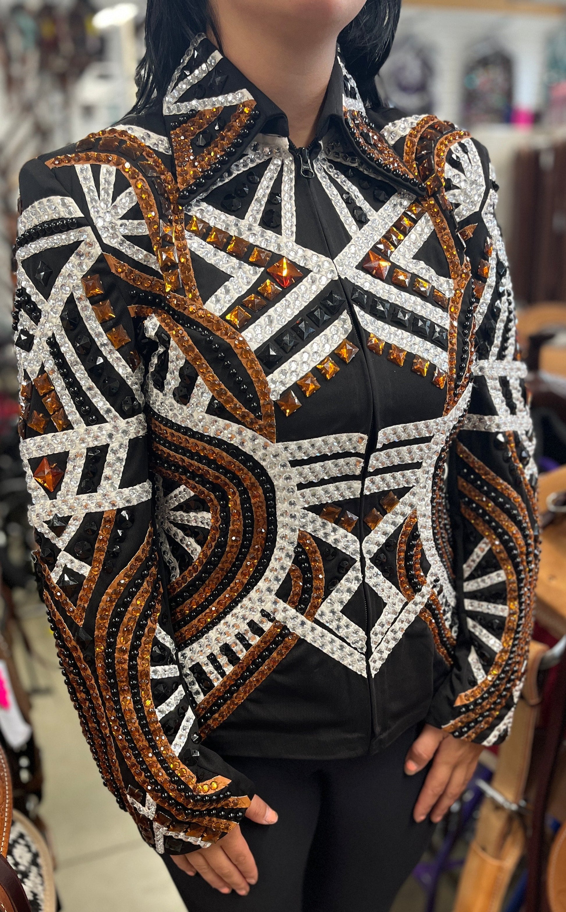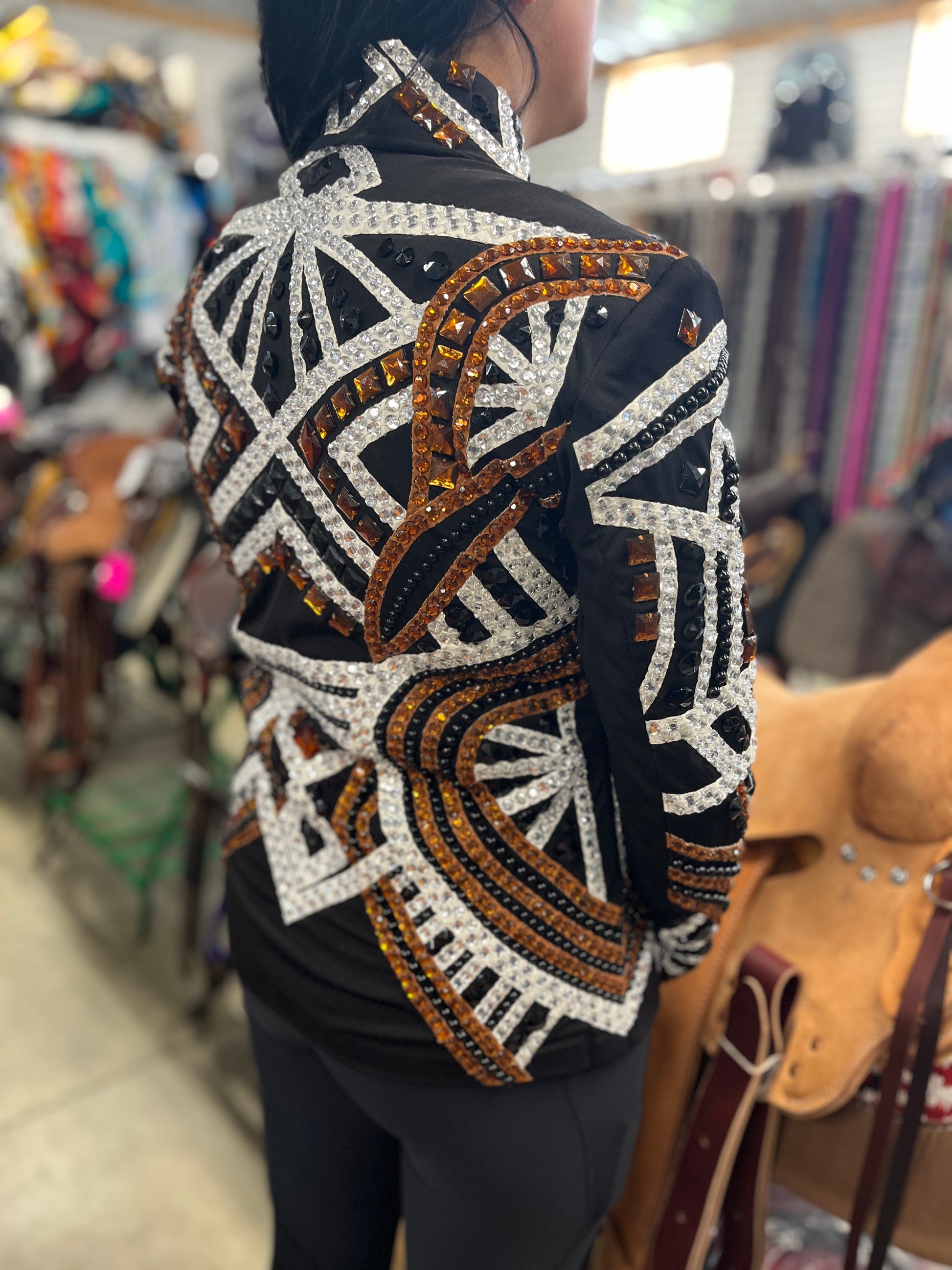Elevate your show attire with the Royal Highness Rust & Silver Show Jacket. Hand-sewn rust and white beading, adorned with crystals, creates an exquisite black jacket. Crafted with high-quality materials, this jacket exudes luxury and elegance. Make a statement in the show ring with this stunning piece.