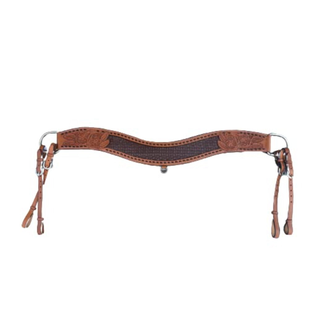 Medium oil leather tripping collar featuring floral tooling overlay accented with brown gator print hide inlay and black buck stitch. Tripping collar is 4" wide and has double tugs.