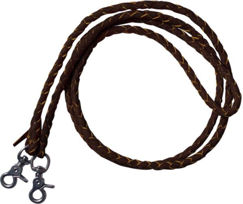 Showman 8 ft. Nylon braided roping rein with leather ends. These reins are nylon braided two tone reins with a scissor snap on one end of the medium leather accent.