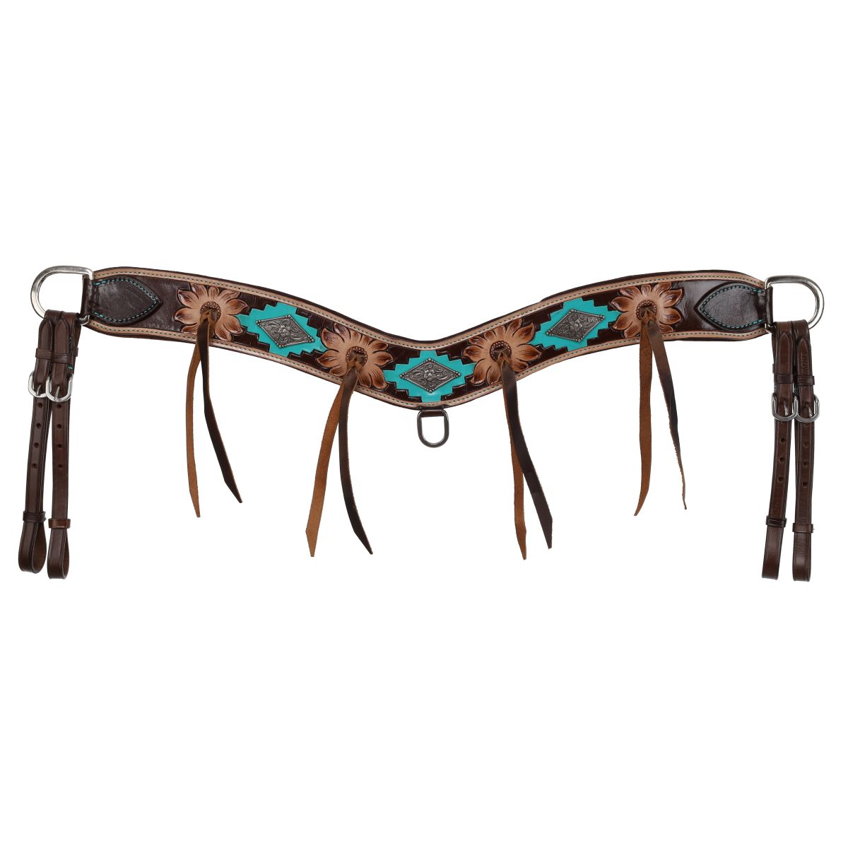 The Showman Aztec Bloom Browband Headstall and Breastcollar Set is a beautiful blend of Western elegance and bold design, perfect for riders who appreciate intricate craftsmanship and vibrant accents. Crafted with a rich chocolate leather base, this set features teal Aztec-shaped inlays that evoke a sense of Southwestern style and adventure. The diamond-shaped floral engraved accents and floral tooling add an extra layer of refinement, showcasing exceptional craftsmanship that enhances the set’s overall appeal.
