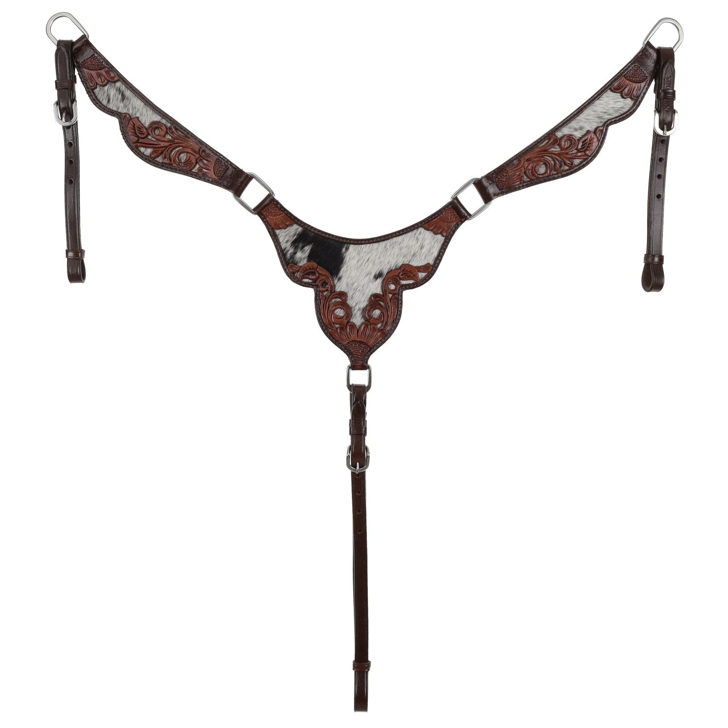 The Showman® Meadow Hide One Ear Headstall and Breastcollar Set is a stunning combination of rustic charm and intricate craftsmanship, designed for riders who appreciate both style and performance. Featuring a premium chocolate leather base, this set is enhanced with authentic cowhide inlays that provide a unique, textured look. The medium oiled floral tooling overlay on both the headstall and breastcollar adds a touch of traditional Western elegance, showcasing exceptional attention to detail and artistry.