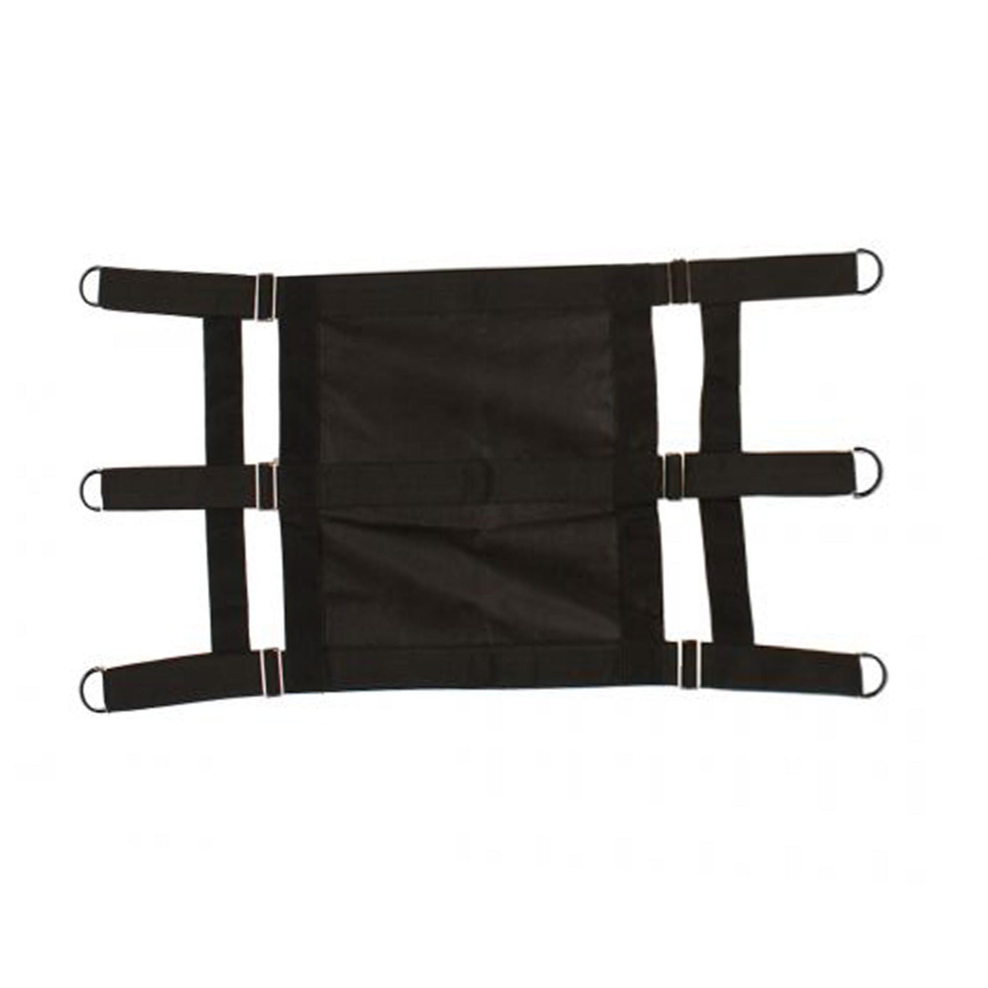 Showman Nylon stall guard. Has a durable solid front with 2" webbed nylon. Easily adjusts to average stall opening. Equipped with heavy duty dee rings.