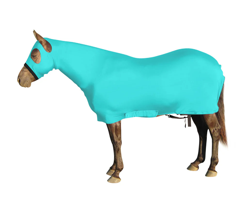 Looking for that "all over" shine? Our Full Body provides your horse head to tail coverage. A full separating zipper from chin to chest allows easy dressing. They also have adjustable rear leg straps with snap hook closures. Made of either nylon or polyester spandex. The body portion is reinforced along the back to prevent over-stretching. Sizing is calculated the same way as a traditional blanket. Size XS (60-64 inches) Blanket Range.