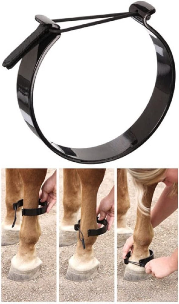 Paw-Be-Gone ankle bands teach your horse to stand quietly without pawing. Bands easily slide over leg and stay secure with an elastic loop. When pawing, this band applies pressure to the coronet band making it uncomfortable for your horse to continue with the bad habit. Heavy powder-coated steel construction is built to last. Sold as a pair. 2 3/4" wide opening, 1" wide x 14 1/4" long metal band To apply, release rubber band and slide onto cannon bone from rear of leg. Paw-Be-Gone can then be lowered over the ankle and down onto the pastern. Once in place, pull rubber band across the opening and into the notch to secure. Paw-Be-Gone should fit loosely but not fall off. If fit correctly it can be used without securing with the rubber band. Do not use when riding or horse is pastured and exercising.