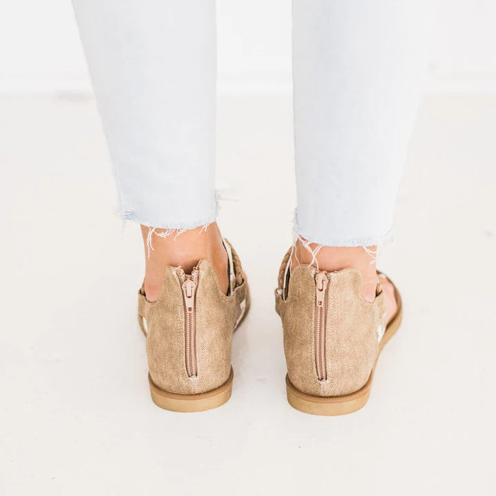 Adorable leopard canvas sandals with the comfiest foot bed! They feature a full sandal upper with a braided accent and zip back.