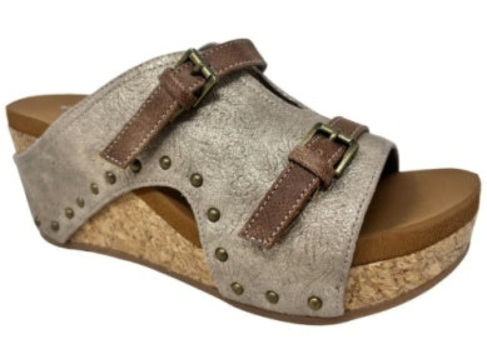 The Very G 'Bellevue' Nude Wedge is a stylish and fashionable choice for any occasion. Featuring a cork wedge and nude vamp with buckle and bronze stud accents, this shoe is sure to turn heads. With a perfect blend of fashion and comfort, this wedge is the perfect way to add some style to any outfit.